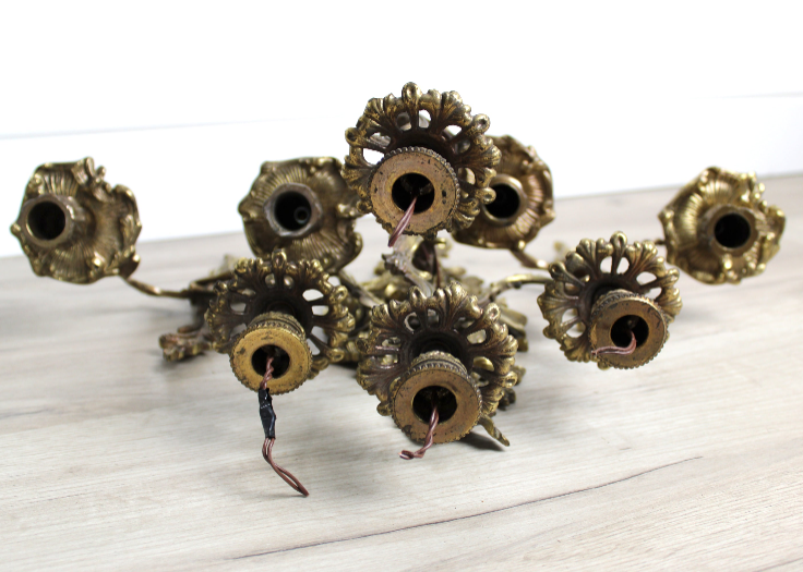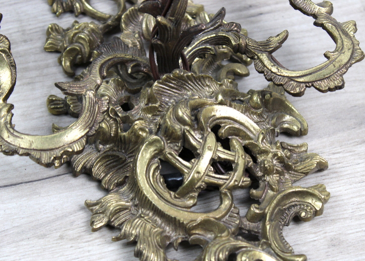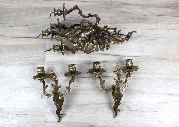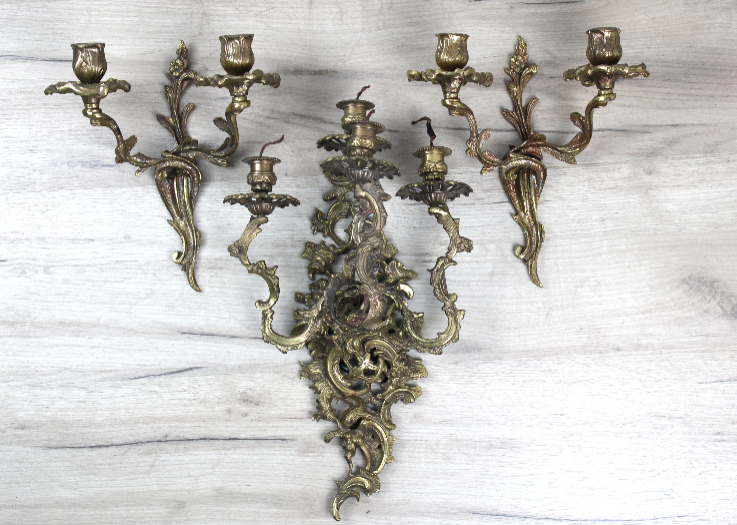 Tris di antiche applique in ottone finemente decorate, arricchite da molti dettagli, composto da due applique laterali più piccole a due fiamme e una grande centrale a quattro fiamme. Possono essere utilizzate anche con candele classiche. Tutto esattamente come da foto.