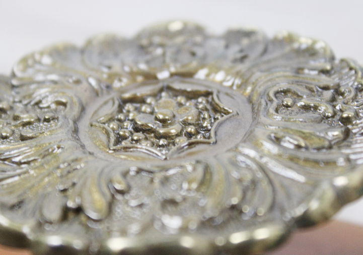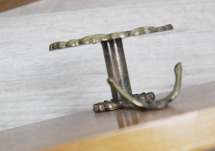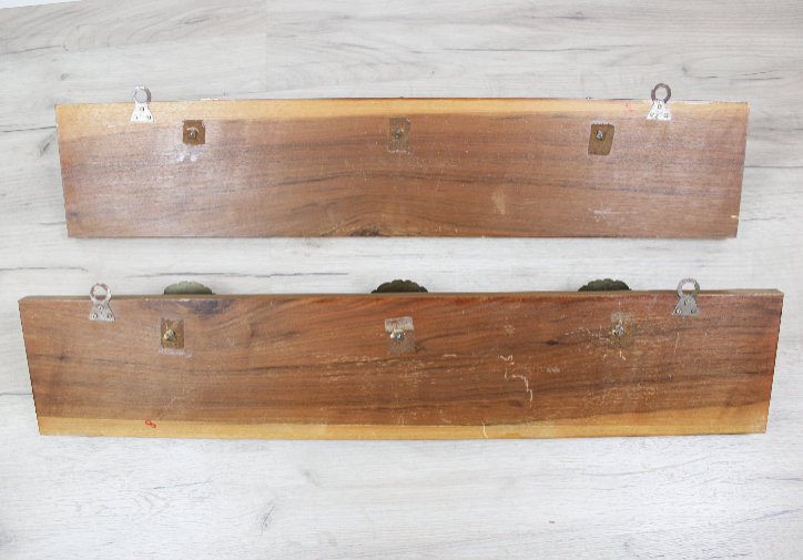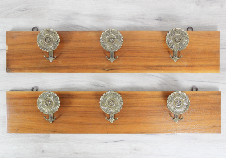 Coppia di appendiabiti vintage da parete con tre grossi ganci rotondi principali in ottone e finemente decorati, su tutti i ganci principali più grossi sono presenti due piccoli ganci secondari. Questi sono fissati su un pannello di legno mediante viti, il pannello ha una superficie liscia. Sul retro sono presenti due ganci di ferro per essere comodamente appesi a parete. Tutto esattamente come da foto.