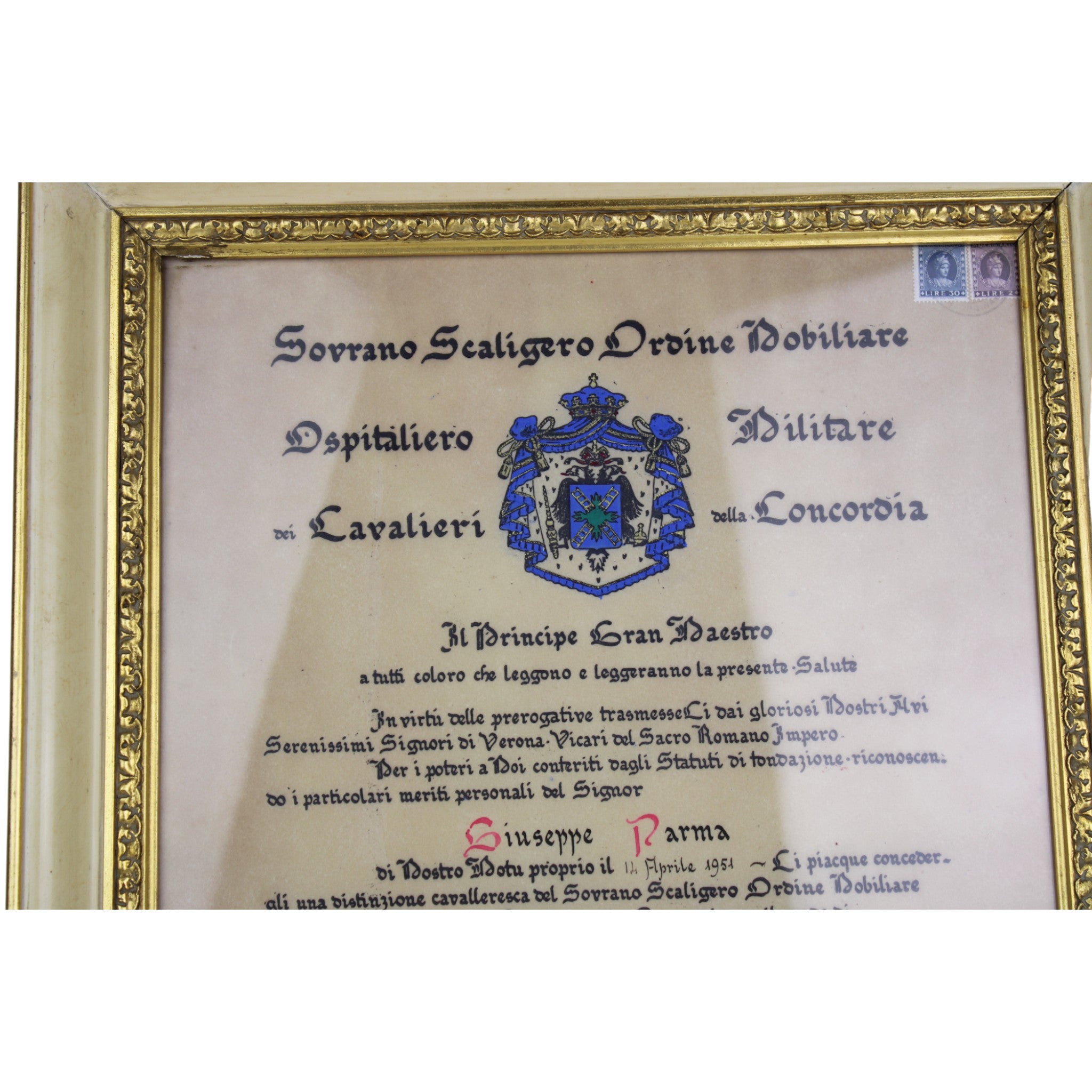 Elegante diploma nobiliare originale, finemente incorniciato, emesso dal Sovrano Scaligero Ordine Ospitaliero Militare dei Cavalieri della Concordia. Il documento è realizzato su carta pergamenata, arricchito da stemma araldico a colori, sigilli a cera rossa, timbri ufficiali e firme autografe.