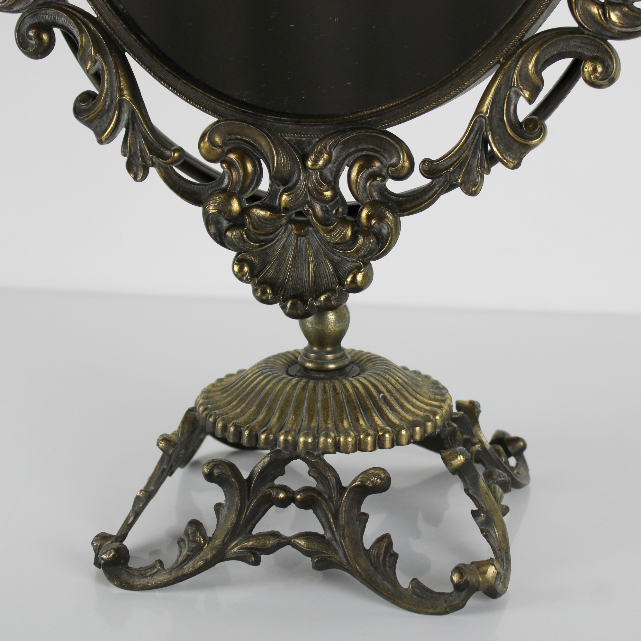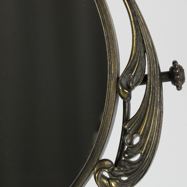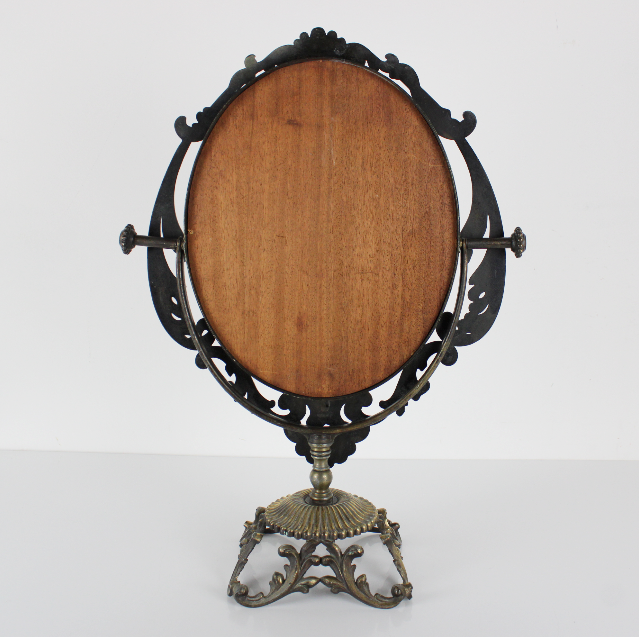 Specchio da tavolo basculante, stile vittoriano con cornice in ottone. Risalente agli inizi del XX secolo. Sui lati sono presenti due manopole anch'esse decorate, che permettono di regolare l'angolatura dello specchio. Dipinto di nero con riflessi dorati. Esattamente come da foto.