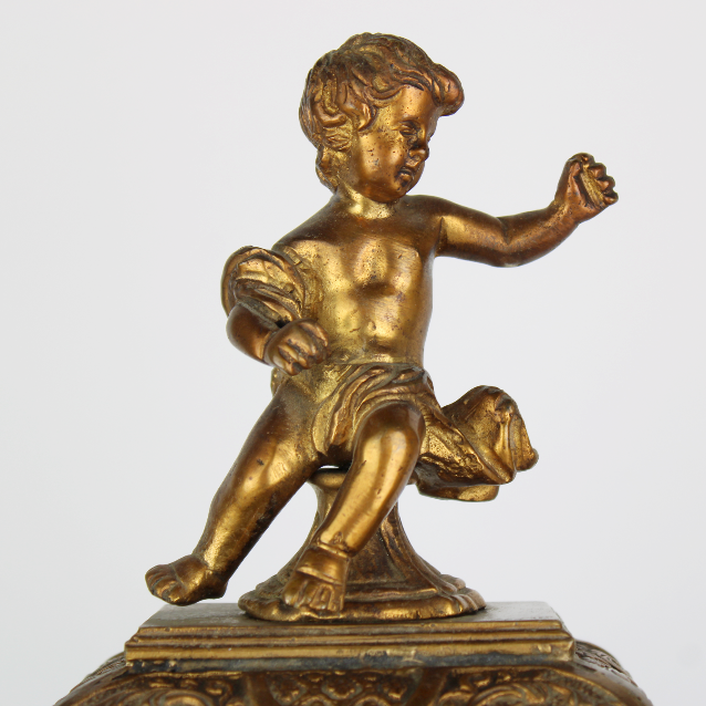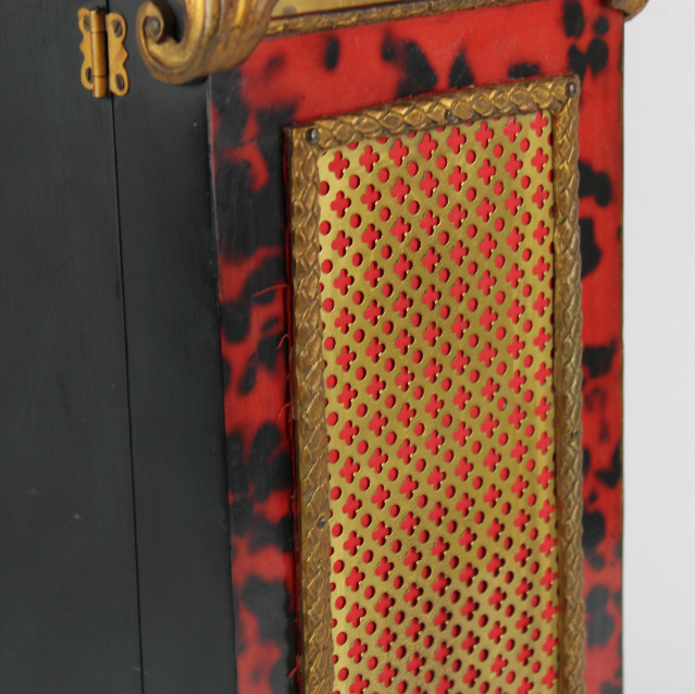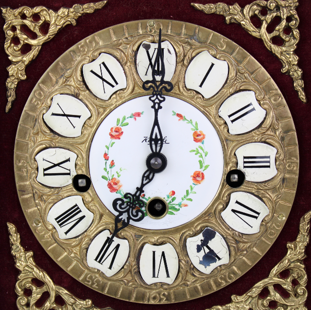 In radica, con lavorazione a intarsio in bronzo, l'interno presenta un quadrante con lavorazione floreale dipinta a mano appoggiato su un tessuto di camoscio rosso. L’orologio è completo di chiave originale dell’epoca molto bella e particolare. Presenta due sportelli apribili, uno frontale ed uno sul retro. Tutto esattamente come da foto.