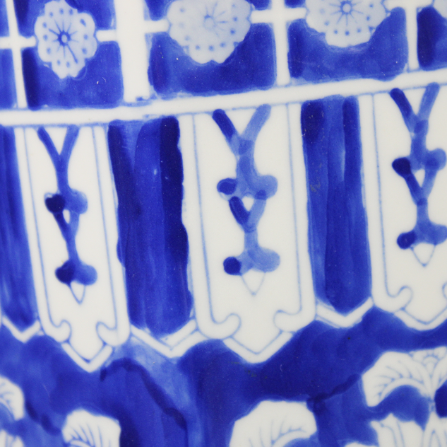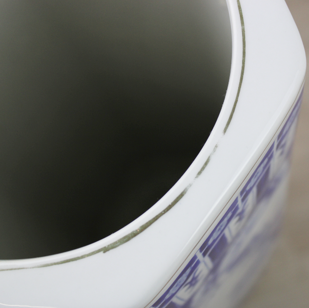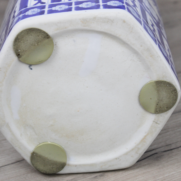 Portaombrelli vintage in porcellana di colore blu e bianco con dettagli dorati sulla parte superiore. Su tutta la superficie del portaombrelli vi sono raffigurate decorazioni di vario tipo tra cui uccelli e piante. Risalente presumibilmente agli anni '80 / '90. Esattamente come da foto.