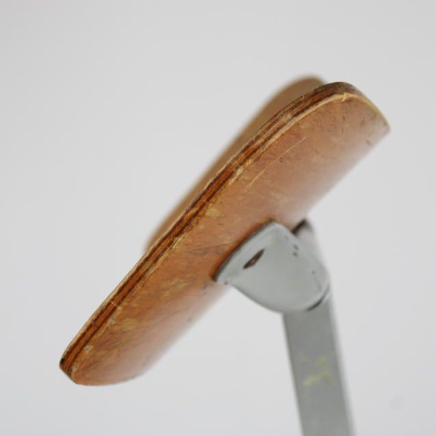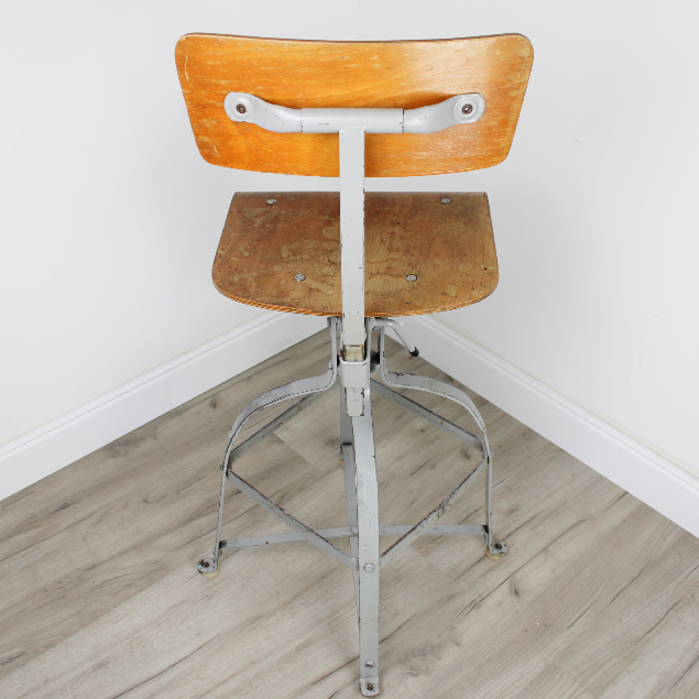 Sgabello girevole industriale regolabile a vite, molto probabilmente trattasi di uno sgabello da architetto per tecnigrafo, La seduta e il poggia schiena sono di legno mentre la struttura è in ferro. E' possibile regolare l'altezza dello sgabello e l'inclinazione dello schienale. Risalente agli anni ’50, provenienza Italia. Ottimo complemento d’arredo vintage.