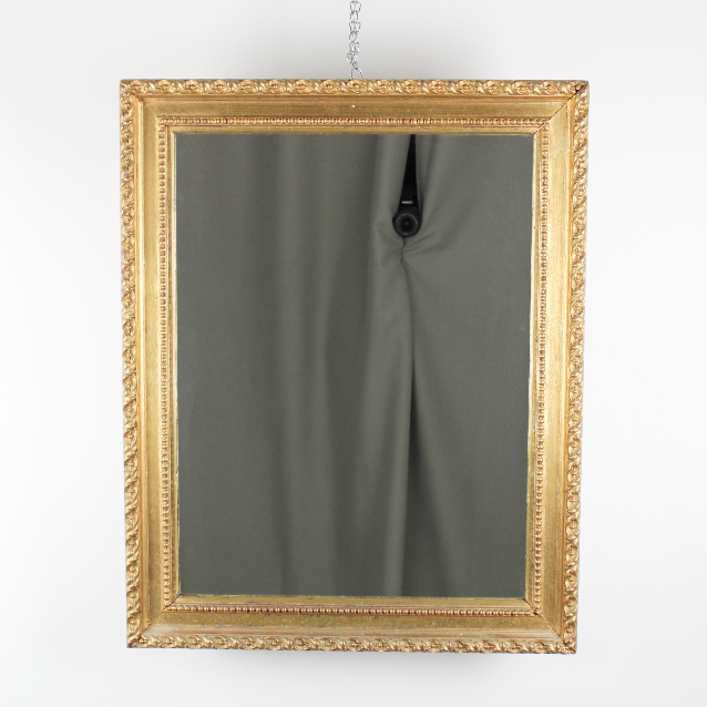 Specchio vintage dalla forma rettangolare da parete con cornice in legno dorata con eleganti dettagli.