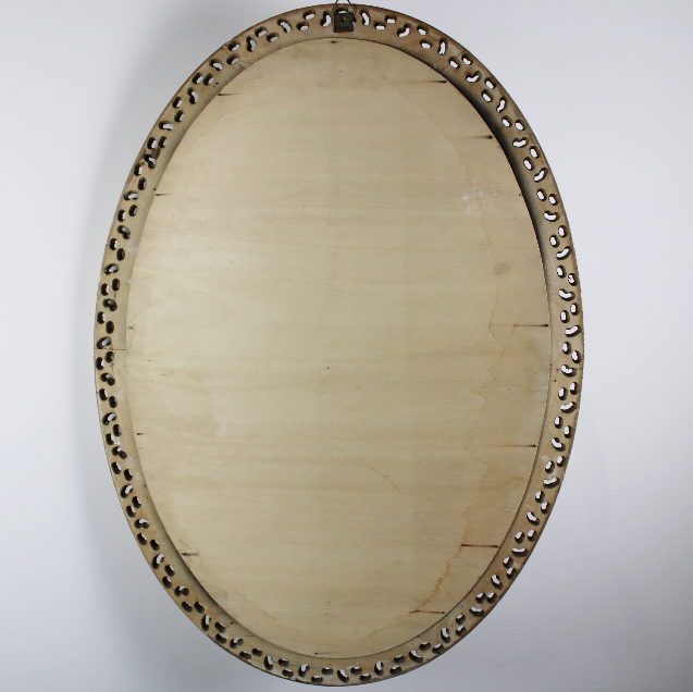 Specchio vintage dalla forma ovale da parete con cornice in legno dorata con eleganti dettagli.
