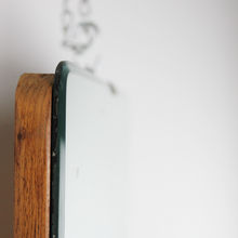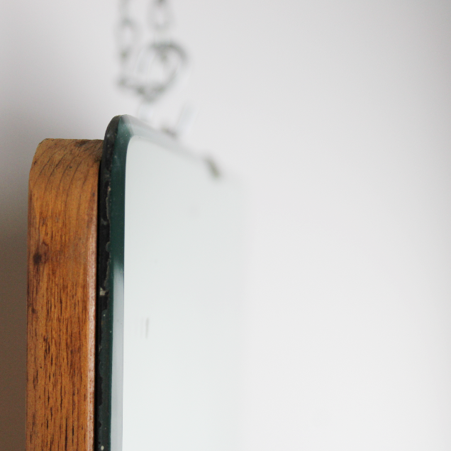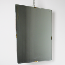 Specchio al mercurio da parete vintage anni '50 con molatura sui bordi. Lo specchio è attaccato ad una lastra di legno mediante eleganti supporti in ottone. Specchio a forma di trapezio. Con comodo gancio per essere appeso. Esattamente come da foto.