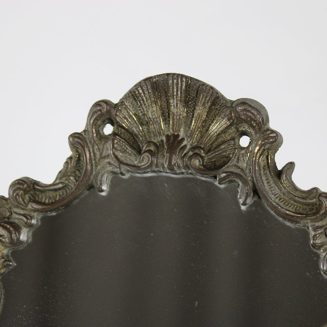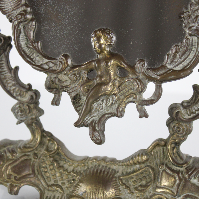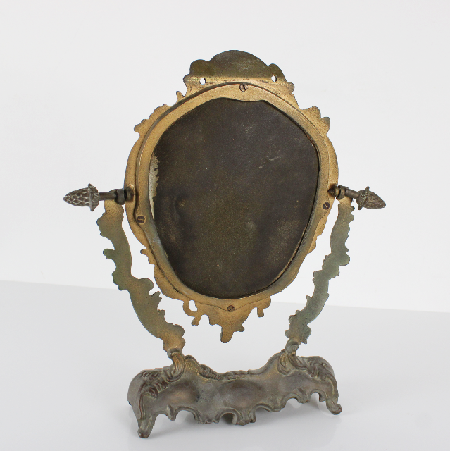 Specchio da tavolo basculante, stile vittoriano con cornice in ottone. Risalente molto presumibilmente alla metà del XX secolo. Sulla cornice ed il piedistallo sono presenti eleganti decorazioni in rilievo. Sui lati sono presenti due manopole anch'esse decorate, che permettono di regolare l'angolatura dello specchio. Dipinto di nero con riflessi dorati. Esattamente come da foto.