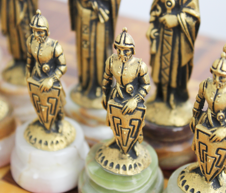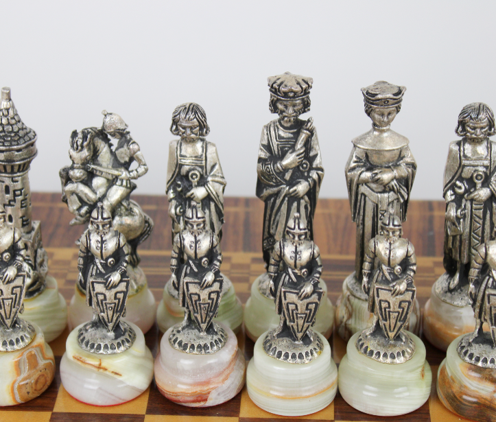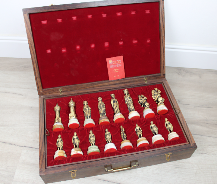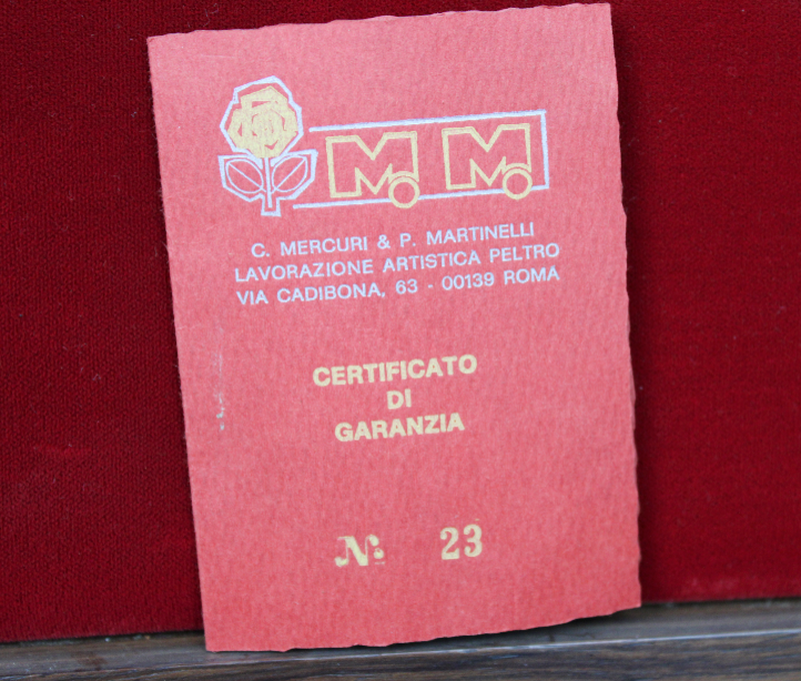Tavolino in legno a tre piedi con dettagli e scacchiera intarsiata dal piano quadrato con i 4 angoli smussati e valigetta anch'essa in legno con interno vellutato di colore rosso e chiusura a scatto garantita da due ganci, è presente anche una comoda maniglia in ottone per facilitarne il trasporto (Peso + di 9 Kg). All'interno della valigetta vi sono pedine in peltro su un piedistallo in onice, un set è dorato mentre l'altro set è argentato. Inoltre all' interno vi è presente il certificato di garanzia in cui si garantisce che del seguente gioco ne sono stati prodotti solo 50 esemplari. Prodotti artigianalmente in Italia dalla ditta C. Mercury & P. Martinelli - Lavorazione artistica peltro - Via Cadibona 63 Roma. Risalente presumibilmente agli anni '80. Tutto esattamente come da foto